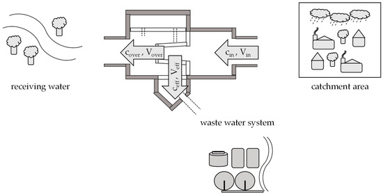 where additionally to Formula (1) Meff stands for the total mass of a constituent in the effluent to the foul sewer and ceff and Veff for the respective constituent concentration and the volume of the effluent. Figure 3 gives an overview of the relevant flows.