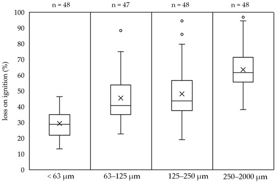 To further gain more insight into the particle size fractions, the loss on ignition was analyzed for all samples. When the solids are incinerated at 550 °C, only the mineral fractions remain. Thus, the mass fraction lost through ignition corresponds to the organic fraction of the sample. Solids with a high organic content tend to have poorer settling behavior due to the increased tendency to flocculate [45,46]. Therefore, information on the organic content is also of great interest with regard to the treatment efficiency of stormwater treatment plants. Furthermore, particles with a high organic content have an increased adsorption capacity [47,48]. Figure 5 shows the loss on ignition of the individual solid fractions. The loss on ignition of the <63 µm fraction is the lowest at approximately 30%. The loss on ignition increases with increasing particle size. In the largest fraction, it is approximately 62%. Due to an error in the sample handling the number of samples of fraction 63–125 deviates from the others.