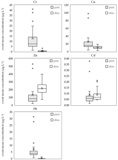 The particulate-bound concentration then was calculated from the difference between the two analyzed phases. The analyzed metals are chromium (Cr), copper (Cu), zinc (Zn), cadmium (Cd), and lead (Pb) as they are typical constituents derived from anthropogenic, in particular vehicular activities [8,28,29]
