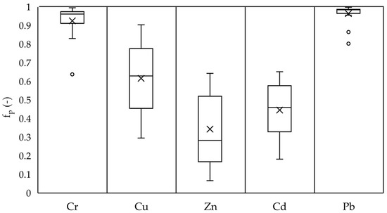Distribution of the particulate fraction, fp, for chromium (Cr), copper (Cu), zinc (Zn), cadmium (Cd), and lead (Pb) on event basis (n = 17).