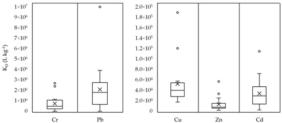 Figure 8 shows the distribution of the corresponding equilibrium partitioning coefficients. Here as well the highest values can be seen for Pb and Cr that supports their high affinity for the particulate-bound phase as it is often documented in the literature. A large dataset of heavy metal contamination in traffic areas examined by Huber et al. [8] highlights that Pb is mostly transported particulate-bound whereas Cu and Zn show a more intermediate behavior. This is also applicable to the results of this study, as can be seen from the Kd values for Cu and Zn. Cadmium could be added to this list as it shows similar values as Cu and shows a high mobility in stormwater runoff even at low concentrations [50]. The order of metals in relation to the highest affinity for particulate phase in this study is: Pb > Cr > Cu > Cd > Zn. This is almost the opposite to the before mentioned order of highest metal mobility.