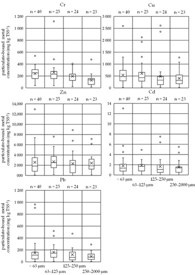 Distribution of particulate-bound metal concentrations in (mg “metal” kg TSS−1) per sample for the metals chromium (Cr), copper (Cu), zinc (Zn), cadmium (Cd), and lead (Pb) in four different particle size fractions (<63 µm, 63–125 µm, 125–250 µm, and 250–2000 µm).