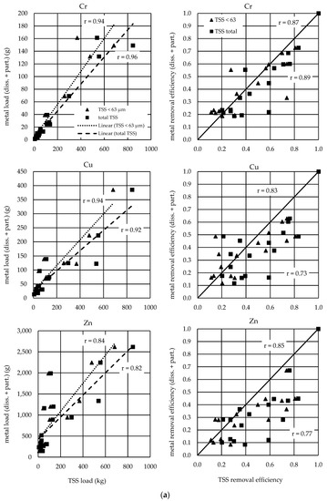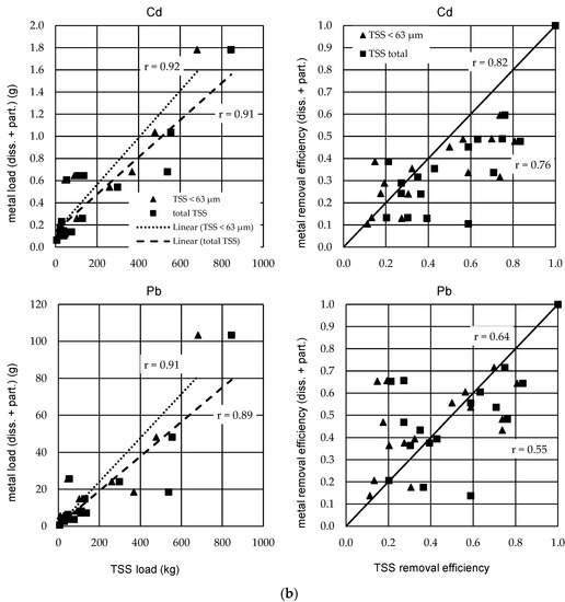 If looking at the correlations in the right section of the figures, a slightly different picture emerges. Pearson correlation coefficients ranging from 0.55 to 0.89 with p-values ranging from 1.33 × 10−6 to 2.36 × 10−2. It can be seen that although the metal load is closely related to the solid load, the retention efficiency of the metal load is significantly different from the retention efficiency of the solid load. The drawn line represents the bisector, making it more obvious that the removal efficiency of the total metal load is overestimated by both total TSS and TSS < 63 µm. This effect can be explained due to a certain proportion of the metals being transported in the aqueous phase.