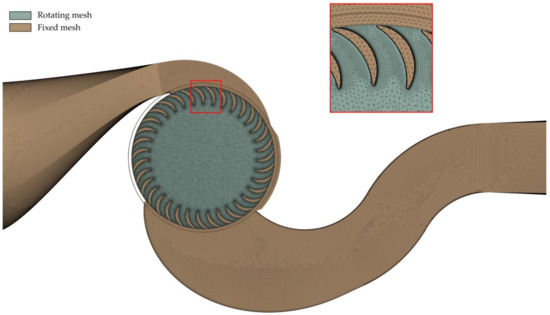 Simulations were carried out using the Ansys CFX commercial code, solving the Reynolds-averaged Navier Stokes (RANS) equations [12,18]. CFX gives the option to select one among different advection models. We chose the high-resolution scheme, which uses second order differencing for the advection terms in flow regions with low variable gradients [18]. The high-resolution scheme uses the first order advection terms in areas where the gradients change sharply, to prevent overshoots and undershoots, and maintain robustness. The RNG k-epsilon turbulence model was selected in the CFX code, according to previous studies [12]; the interface between the stationary and rotating domains was the transient rotor-stator type. The time step adopted for each run was 2.5 × 10−4 s. The root mean square residual was used for the convergence criterion with a residual target equal to 1.0 × 10−5. The boundary conditions selected in the simulation according to the design data are the following: (a) the total pressure per unit weight at the nozzle inlet, corresponding to the piezometric level plus the kinetic energy per unit weight, (b) the flow rate at the outlet section of the casing. The initial condition for unsteady state simulation was the fluid field output computed, according to the steady state flow assumption.