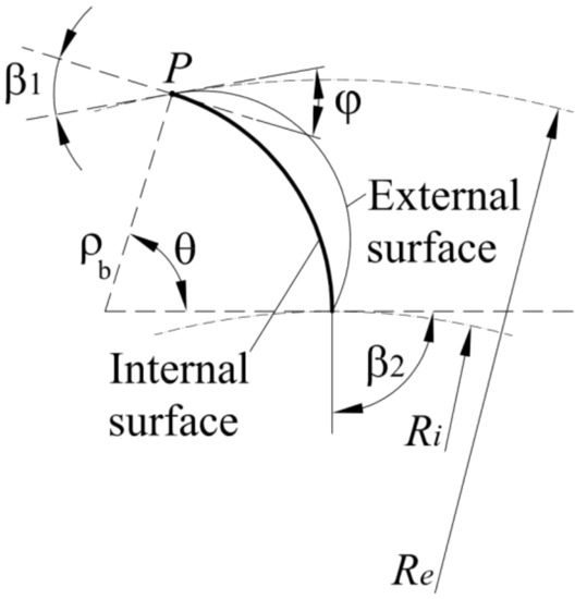 In the proposed new blade section, the internal surface is the same traditional one with circular shape, and the center of the circle is located at the intersection of the two directions orthogonal to the inlet and outlet relative velocities (Figure 5). The exit angle β2 is equal to 90°. The inlet angle β1 guarantees to the inlet water particles a relative velocity tangent to the inlet blade surface. Note that, because the velocity norm V in Equations (1), (2) and (4) represents the mean value along all the inlet impeller surface, the radial velocity component in P is smaller than the mean value, due to the φ angle existing between the directions tangent to the internal and the external surface. This also implies that the velocity ratio in Equation (2) is smaller than the ratio computed using the local velocity in P instead of the mean one. Previous experiments suggest a value equal to 2 [20]. According to this hypothesis, the radius ρb, the angle β1 and the central angle θ of the blade can be computed as a solution of Equation (5), setting the optimal value of the impeller inner diameter ratio Di/D equal to 0.75 [16].