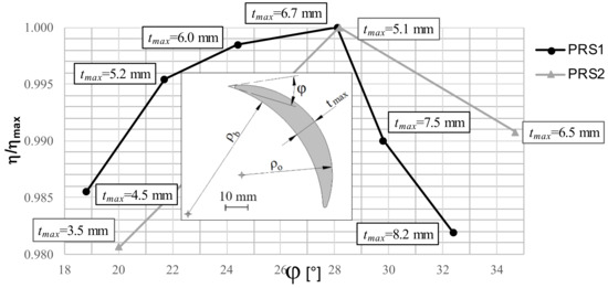 Table 1 lists the parameters of two case studies of the PRS turbine, marked as PRS1and PRS2, with a traditional circular profile of the external surface. Note in Figure 6 the corresponding turbine efficiency computed for several φ values and corresponding maximum thickness tmax, scaled by the best efficiency obtained for an angle φ = β1 (see Figure 5). The efficiencies are computed with 2D CFD simulations, setting a fixed pressure value in the inlet and outlet boundaries. The number of blades is optimized for each couple of φ and tmax values. Sharp edges are well known to provide a local stress concentration along the same edges, which can be avoided by rounding off the edges with a circular profile, as shown in Figure 7a. A value tmin = 0.1 tmax corresponds to a maximum stress located outside the edge, without a significant reduction of the hydraulic efficiency with respect to the value obtained with tmin = 0. We note in Figure 6 that the maximum efficiency is computed for both PRS1 and PRS2 with φ = β1, corresponding to an external surface tangent to the inlet impeller surface. The reason is likely to be that the increment of the φ angle provides a reduction of the α attack angle of the water particles along a large part of the channel inlet, and a corresponding efficiency increment. For φ values larger than β1, the attack angle becomes negative, with a sharp efficiency reduction.