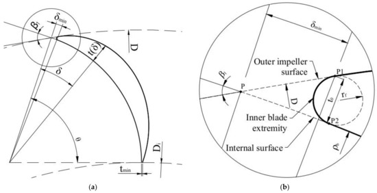 The angle δmin and the thickness t0 are the parameters of the tip of the blade and are computed to guarantee the tangent condition of the external blade surface to the impeller inlet surface. The inner blade extremity has a circular profile with radius rf, tangent in point P1 to the cubic spline profile of the external surface and in P2 to the circular profile of the internal surface (Figure 7b). rf is empirically set equal to 0.1 tmax.