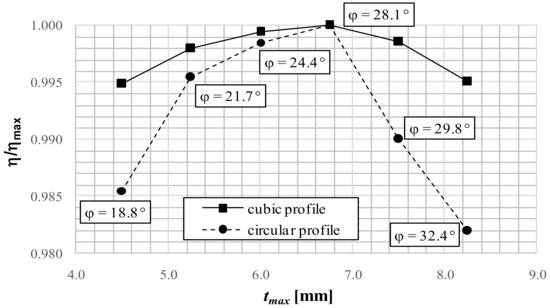 Equations (7–11) guarantee the tangent condition of the external surface to the inlet impeller surface for different possible values of the maximum thickness. Figure 8 shows how the cubic profile allows to maintain high efficiencies, in the PRS1 turbine, while changing the tmax thickness value.