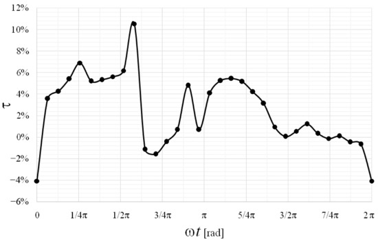In crossflow impellers, the torque of the blades at a given time is not the same, because it depends on the position of the blade itself. Figure 9 shows the τ distribution obtained in PRS1 turbine for a given blade, as function of its position. The total number of blades was 31.
