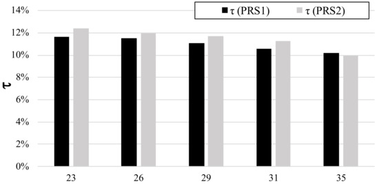 The trend of τ shows a strong variation since, as is well known, in crossflow turbines the shaft torque is provided by the flow that runs through the impeller in two different stages, known as first and second stages. In the transition between the first and second stages, the blade is stressed in the opposite direction due to the dragging action it exerts on the fluid, which does not constitute the main jet. The contribution to the overall power of the first stage is always greater than the second stage, with a peak for the single blade, which we call τmax. Using several CFD 2D test cases the behavior of this parameter was analyzed as a function of the number of blades of the impeller, within the range 22–35 suggested by most of the authors (see Table 3). The results obtained for two different impellers are summarized in Figure 10. We can observe that the maximum value of the ratio τ drops very slowly, along with the increase in the number of blades, in the analyzed range. For this reason, the maximum von Mises stress s is initially assumed independent from the number of blades.
