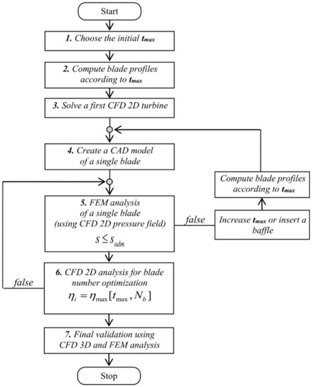 - If the maximum thickness used in point 4 leads to a maximum von Mises stress value above the admissible one, here indicated as Sadm, then a new attempt must be made. To this end, either increase the maximum thickness or introduce a new reinforcing baffle. Using the new geometry, compute again the corresponding blade section and update the number of blades with the optimal one corresponding to the new maximum thickness by iteratively solving a 2D CFD model. Update the pressure distribution on the blade surface and go back to point 5. The trial and error procedure must be repeated until the computed maximum stress is below the admissible one.