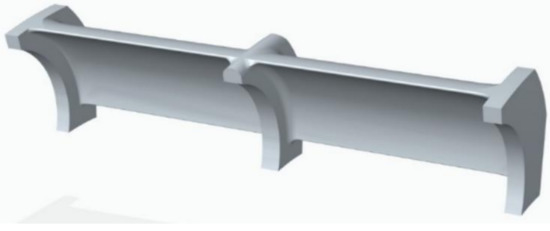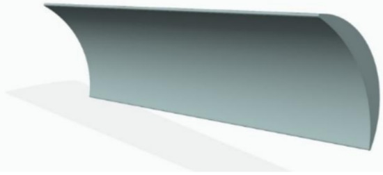 Once the cross-section of the blade is designed in step 2, a 3D CAD model of a blade with a length equal to the width B of the impeller has to be designed in step 4. See, in Figure 12, the blade obtained in the next case study, adopting t = 7 mm and B = 55 mm.