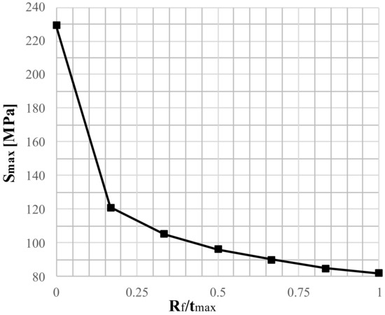 As expected, the peak stress level first decreases very quickly when the fillet radius increases; then the reduction becomes slower and slower (see Figure 13). It was found that the stress level seems to converge for values of Rf/tmax ratio higher than 0.833. A ratio Rf/tmax = 0.833 is also a reasonable design choice.
