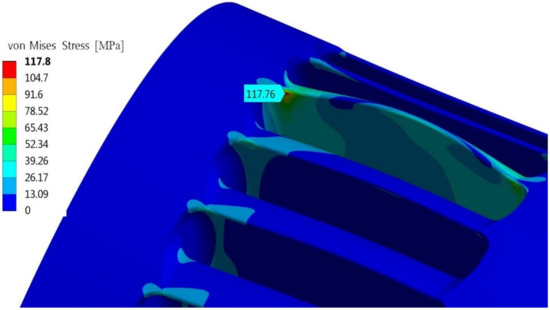 Three different impellers, made of stainless steel, were designed using traditional blade design (impeller 1 and 2) and the new proposed blade design (proposed impeller). The tensile strength for stainless steel, Sr, was set equal to 500 MPa, with a corresponding fatigue limit Sl equal to 250 MPa. Application of a reasonable safety factor 3 [31,32] provided Sadm = 250/3 MPa = 83.3 MPa. The external surface of the blades of impeller 1 had a circular profile. The corresponding maximum efficiency was η = 79.3%, attained for φ = β1, tmax = 5.12 mm and a number of blades equal to 34. The maximum von Mises stress Smax = 117.76 MPa was not lower than the admissible limit Sadm (see Figure 16, where the stress is the result of 3D FEM analysis).