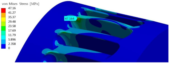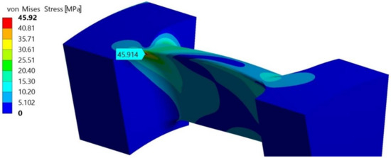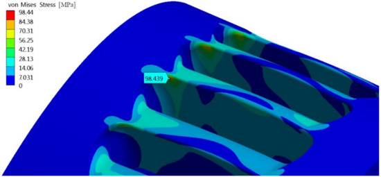 In the real installation, the PRS is equipped with a negative brake, to be used in the case of sudden failure of the electric network. When the network fails, the brake blocks the impeller rotation, and the water flow increases up to 1.4 times the design value [13]. In this case, the impeller is subject to higher normal stresses than those previously seen, but no cycle occurs. In this case, for the proposed blade profile, the 3D FEM analysis computed a maximum von Mises stress equal to 98.44 MPa (Figure 21), which is lower than the tensile strength, around 215 MPa.