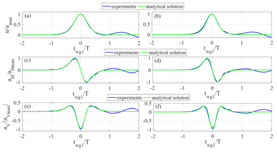 Figure 4c,d, the horizontal acceleration instead exhibits a positive peak before the occurrence of the wave crest and a negative peak of the same magnitude after it. Lastly, the vertical acceleration highlights two positive peaks and one higher negative peak between them, corresponding to the maximum surface elevation (see