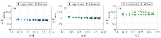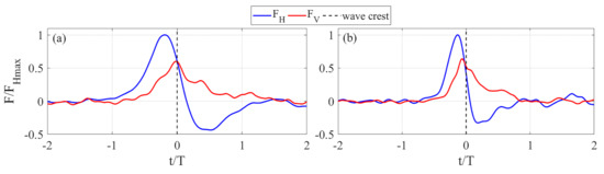 Figure 4e,f). The importance of the above kinematic components arises from its shape similarity if compared to the wave load components modeled by the Morison and transverse semi-empirical schemes. Indeed, the horizontal velocity is proportional to the drag and lift force components, the horizontal inertia load follows the shape of the horizontal acceleration, and the vertical acceleration is similar to the vertical inertia force.