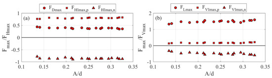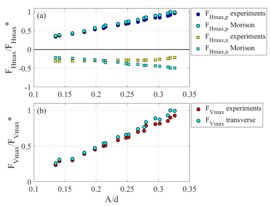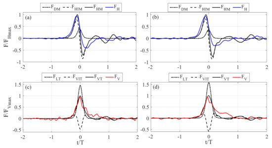 Figure 4e,f). The peak of the laboratory vertical force proves to be in phase with the lift component, which is proportional to the horizontal velocity. However, the peak of the lift load is larger than the experimental vertical one and, to well-model this load, the contribution of the vertical inertia component is fundamental, since it acts to reduce the peak of the transverse model through its negative part. This effect is particularly emphasized for test no. 18.
