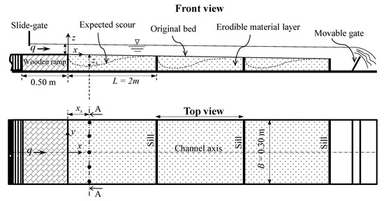 The experiments on the scour processes were carried out in a rectangular flume of closed-circuit flow at the Hydraulic Laboratory of the Mediterranean Agronomic Institute of Bari (Bari, Italy). The flume had glass sidewalls and a Plexiglas floor, allowing a good side view of the flow. It was 7.72 m long, 0.30 m wide, and 0.40 m deep. A pump with a maximum discharge of 24 L/s was used to deliver water from the laboratory sump to an upstream tank equipped with a baffle and lateral weir, maintaining a constant head upstream of a movable slide gate constructed at the inlet of the flume. The slide gate regulates channel flow discharge. To create a smooth flow transition from the upstream reservoir to the flume, a rectangular wooden ramp, playing the role of a first GCS, was installed at the inlet of the flume; it was 1.55 m long and 0.15 m thick, and of the same channel width (Figure 1). At the outlet of the flume, water was intercepted by a stilling tank, equipped with three vertical grids to stabilize water, and a triangular weir (V-notch sharp crested weir) to measure the discharge with a relative uncertainty of ± 8%. At the downstream end of the flume, a movable gate made of Plexiglas and hinged at the channel bottom was used to regulate the flow depth.
