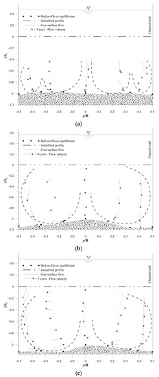 In Figure 2, the flow velocity distributions in the scour cross-sections (looking downstream) clearly show the development of secondary current cells. The secondary current cells represent a circulation of fluids in the plane orthogonal to the axis of the primary flow. Figure 2 shows the formation of a helical motion rotating in opposite directions, as indicated by the curved arrow made of dashed lines in the figure. For test T10, Figure 2a shows the formation of a series of secondary current cells across the scour hole, similarly to what happens in large straight channels [20]. The four helical cells shown in the figure are symmetric with respect to the (x, z) plane at y/B = 0 (plane of flow symmetry). Figure 2a also shows an undulating sediment profile (manifested by two sediment ridges at y/B = −0.25 and 0.25) in the transverse direction. According to previous studies [20,21], the undulating sediment profile, generated by secondary current cells, may affect both the whole depth-flow field and the free surface flow pattern. Figure 2b,c indicates the formation of only two large counter-rotating vortices and a single sediment ridge, located around the channel axis (y/B = 0). For tests T12 and T13, the vortices pushed the water outward (towards the channel wall) in the upper part of the scour cross-section, while, near the bottom, the water was driven inward [19], forming the sediment ridge at the center of the channel. According to previous studies (e.g., [20,21]), the hydrodynamics of secondary currents is strongly influenced by the aspect ratio, Ar (Table 1), and the number of secondary current cells varies in proportion to the latter. This could explain the increase in the number of secondary current cells with test T10, of Ar = 2.44, compared to tests T12 and T13, of Ar = 1.76 and 1.55, respectively. Figure 2 shows that the width of the secondary current cells is 0.6hs, 0.9hs, and 0.8hs with tests T10, T12, and T13, respectively. This finding agrees with that found in previous studies [20,34], claiming that the width of secondary current cells scales with the flow depth.