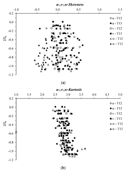 To investigate the hydrodynamic structure across the scour hole well, a high-resolution time series of the flow velocities with high quality is required. The magnitudes of the flow velocity vectors reported in Figure 2 are the result of over 4500 measurements of the instantaneous velocity components. Figure 3, as an example, shows the velocity skewness and kurtosis distribution of all measured velocities across the scour hole at xs for tests T12 and T13. Figure 3a shows that the skewness of the three velocity components u, v, and w was between −0.5 and 0.5 in most measuring positions. This implies that the measured velocity data were symmetrical. Figure 3b shows that u, v, and w kurtosis saturated to a value around 3. These results are similar to the Gaussian case (skewness = 0 and kurtosis = 3), indicating that most of the values of each measured velocity component clustered around the mean value, which means that the ADV instrument was performing satisfactorily.