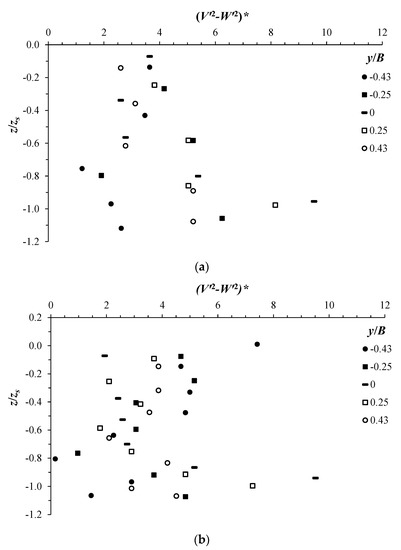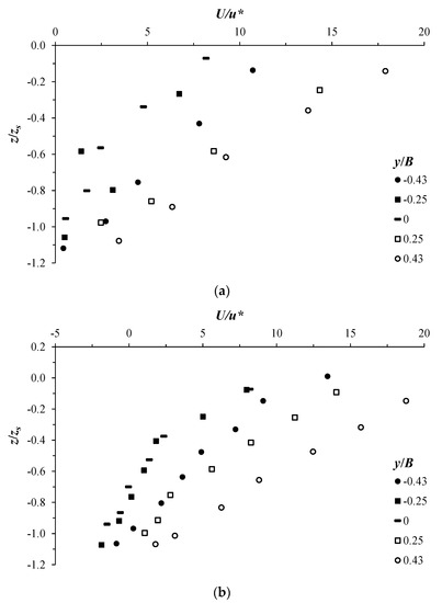 Figure 4 shows the vertical profiles of the normalized velocity U/u* at the transversal positions y/B = −0.43, −0.25, 0, 0.25, and 0.43 across the scour hole at xs. Here, the friction velocity u* was determined based on the measured primary Reynolds shear stresses U′W′ near the scour bed, and Z/hsy < 0.2, u* = (−U′W′)0.5, Z, and hsy are defined below. The vertical position z is normalized by zs, and originates at the initial bed profile, as shown in Figure 2. The data refer to test T12 (Figure 4a) and test T13 (Figure 4b). At the different transversal positions y/B, U/u* shows the same trend along the vertical. It is considerably reduced approaching the scour bed. For both tests, the profiles of U/u* are shifted from each other, indicating an anisotropic transversal distribution. At the downwelling flow regions, at y/B ≤ −0.25 and y/B ≥ 0.25 (see Figure 2), the stream-wise velocity shows the largest values, while it is reduced at the upwelling flow region, around y/B = 0. This result is in good agreement with that found by Albayrak and Lemmin [20] and Stoesser et al. [27], confirming the significant influence on the primary flow by the secondary current cells.