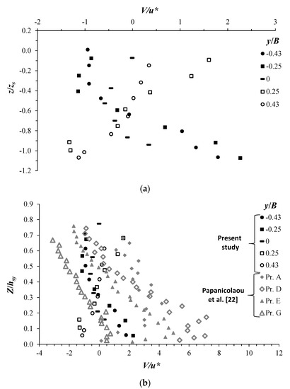 Normalized span-wise velocity V/u* at different transversal positions y/B across the equilibrium scour hole at xs: (a) data refer to test T13, and the vertical position z (small) originates from the initial bed profile and is normalized by zs, as in Figure 2; (b) comparison between the data of the present study of test T13 and the data obtained by Papanicolaou et al. [22] on a natural river. Here, the vertical coordinate Z (capital) originates at the scour/channel bed and is normalized by the flow depth hsy. The profiles Pr. A, Pr. D, Pr. E, and Pr. G were taken at y/B = −0.34, 0, 0.16, and 0.40, respectively.