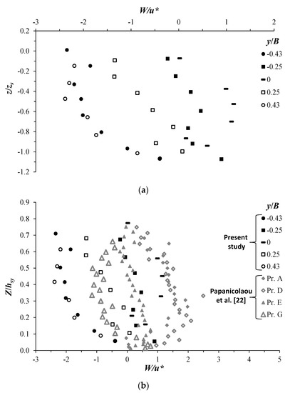 Figure 6 shows the profiles of the normalized vertical velocity W/u* for the present study and that by Papanicolaou et al. [22]. Figure 6a illustrates the profiles of W/u* of test T13 of the present study in the scour hole at the downstream position xs. To clearly show the flow features in the scour hole, we also plotted W/u* versus z/zs (as explained above). In the downwelling flow regions (y/B < −0.25 and y/B < 0.25) (see Figure 2), W/u* undergoes negative values, varying in an arched way (of concavity to the right) along the vertical: it increases in magnitude with increasing depth, reaches extreme values of O(−3) at z/zs ≈ −0.5, and then begins to gradually decrease (in magnitude), tending toward zero close to the scour bed. In the upwelling flow region (around y/B = 0), W/u* shows positive values, behaving in a similar fashion (in an arcuate way, but with concavity to the left) along the vertical as in the downwelling flow regions. In the intermediate regions (y/B = −0.25 or 0.25, as an example), W/u* can change sign from negative to positive and vice versa along the vertical. This behavior of W/u* through the scour hole is a result of the flow circulation caused by the secondary current cells. Figure 6b represents a comparison between the W/u* profiles of test T13 of the present study and those by Papanicolaou et al. [22]. Here, W/u* is plotted versus Z/hsy (as explained above). The profiles shown in Figure 6b almost indicate the same order of magnitude of W/u* for both studies, ranging between about −3 and 3. At relative transversal positions within a secondary current cell, Figure 6b also reveals that W/u* follows a similar trend along the vertical direction for both studies. The different vertical profiles of W/u* relative to a single secondary current cell show a sort of φ-shaped distribution.