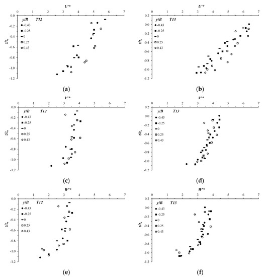 The profiles of the flow turbulence intensities at the different transversal locations y/B = −0.43, −0.25, 0, 0.25, and 0.43 across the equilibrium scour hole at the downstream position xs are shown in Figure 7. The normalized turbulence intensities in the stream wise direction, U′*, span-wise direction, V′*, and vertical direction, W′* for tests T12 and T13 are plotted in Figure 7a–f, respectively. Here, U′*, V′*, and W′* are defined as the ratio of the standard deviation of the stream-wise, span-wise, and vertical flow velocity component fluctuations in the friction velocity, u*, respectively. To show the profiles inside of the scour hole, in Figure 7, we adapt the normalized vertical coordinate z/zs (as explained in Section 4.1).