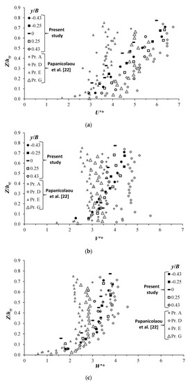 In Figure 8, we plotted the vertical profiles of U′*, V′*, and W′* of test T13, together with those conducted by Papanicolaou et al. [22]. Note that, for the sake of consistency between both studies, we adopted in these figures the normalized vertical coordinate system Z/hsy. In Figure 8, U′*, V′*, and W′* show similar trends along the water column. Furthermore, U′*, V′*, and W′* experience quite comparable values, despite the difference in hydraulic and geometric conditions among both studies. A shifting between the profiles of turbulence intensities occurred for both studies, which is pronounced with the data of Papanicolaou et al. [22], possibly due to the strong bending effect. Contrary to conventional findings in open channels, Figure 7 and Figure 8 show that the three turbulence intensities U′*, V′*, and W′* decrease as the channel bottom approaches. This means that the momentum exchange occurs from the bottom towards the surface and not the opposite, as usually confirmed by conventional findings, which may be attributed to the presence of secondary flows [22].