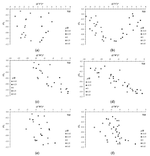 Reynolds shear stresses normalized by the square friction velocity at different transversal positions y/B across the scour hole at xs: (a,b) span-wise shear stress (U′V′)* for tests T12 and T13, respectively; (c,d) primary shear stress (U′W′)* for tests T12 and T13, respectively; (e,f) secondary shear stress (V′W′)* for tests T12 and T13, respectively.