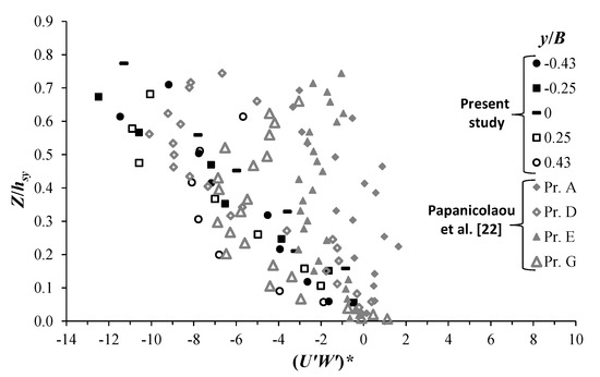 Figure 10 presents a comparison between the shear stress (U′W′)* of test T13 of the present study and that obtained by Papanicolaou et al. [22]. Here, we adopt the normalized vertical coordinate system Z/hsy (as explained above). Figure 10 indicates that, for both studies, (U′W′)* profiles have a similar tendency, especially over Z/hsy < 0.3, where the data of both studies tend to collapse together. Furthermore, at Z/hsy < 0.3, (U′W′)* in Papanicolaou et al. [22] shows the largest strengths in the downwelling regions (Pr. G) compared to that in the upwelling regions (Pr. D and Pr. E). The variation of the Reynolds shear stress values along the transverse direction, between downwelling and upwelling flow regions, reflects the oscillatory nature of the flow induced by the secondary currents, as also confirmed by Albayrak and Lemmin [20].