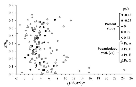 The comparison between the anisotropy term of the normal stresses (V′2 − W′2)*, shown in Figure 11, and the secondary shear stress (V′W′)*, shown in Figure 9, indicates that they have opposite signs, and (V′2 − W′2)* has an order of magnitude larger than (V′W′)*, agreeing with most of the findings in the literature. Furthermore, (V′2 − W′2)* shows greater (y, z) spatial variation compared to (V′W′)*, obviously leading to higher gradients. In the literature (e.g., [26,28,34,35,36]), the condition for the generation of a secondary current in straight non-circular turbulent channel flows was considerably discussed, giving rise to two opinion groups. The first group suggested that the anisotropy term of normal stresses, A5, is dominant, providing an essential condition to induce the secondary currents. The second group argued that this term does not play a main role in the generation of secondary currents, but that the latter are the results of the variation of bed roughness or morphology. As indicated above, Figure 11 shows maximum values of (V′2 − W′2)* near both the scour mouth and scour bed, which is more pronounced with test T13 in Figure 11b. The large values of (V′2 − W′2)* in the vicinity of the scour mouth may be the results of high turbulence intensities induced by the incoming jet flow from the grade control structure [17], while those close to the bed are perhaps enhanced by the deformation of the transversal scour bed and development of sediment ridges [1,20,22]. A significant increase of (V′2 − W′2)* near the bed channel is also clearly distinguishable with the data of Papanicolaou et al. [22], as shown in Figure 12. Figure 12 reports a comparison among the data of test T13 in the present study and those of Papanicolaou et al. [22], plotted with the normalized vertical coordinate Z/hsy. Since the secondary currents (of the first kind) in Papanicolaou et al. [22] were driven by a vortex tilting mechanism due to the channel curvature effect, the presence of high turbulence in the cross-sectional planes, generating an imbalance of normal Reynolds stresses, provides additional driving forces that maintain and enhance secondary flow motions.