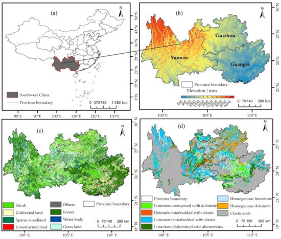 - Zhang, C.; Qi, X.; Wang, K.; Zhang, M.; Yue, Y. The application of geospatial techniques in monitoring karst vegetation recovery in southwest China: A review. Prog. Phys. Geog. 2017, 41, 450–477. [Google Scholar] [CrossRef]
