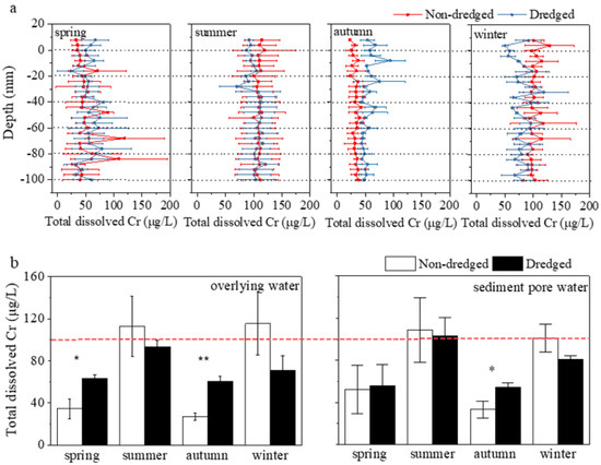 Figure 1 and Figure 2 show the vertical distributions and average concentrations of total dissolved Cr and DGT-labile Cr(VI), respectively. The total dissolved Cr and DGT-labile Cr(VI) concentrations in the overlying water and sediments fluctuated marginally with depth, across a depth range of 8 to −100 mm, at a resolution of 4.0 mm. Therefore, an average of different depths (vertically ranging from 8 to 0 mm for overlying water and from 0 to −100 mm for sediment) was used to explore the impact of dredging on the total dissolved Cr and DGT-labile Cr(VI) concentrations. The evident seasonal variability of the total dissolved Cr and DGT-labile Cr(VI) is mainly owing to the seasonal cyanobacterial blooms and Mn redox [24]. In summer, the high concentration of total dissolved Cr was primarily caused by the complexation of Cr(III) with dissolved organic matter (DOM). The DOC complexed with Cr(III) was mainly produced by the cyanobacterial blooms in summer. In winter, the high concentrations of total dissolved Cr and DGT-labile Cr(VI) in aerobic sediments were primarily caused by reoxidation of Cr(III) by Mn(III/IV) oxides, as evidenced by the lowest concentrations of dissolved and DGT-labile Mn(II) [24].