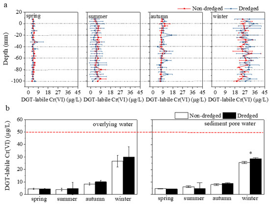 The vertical changes (a) and average (b) of DGT-labile Cr(VI) at sediment and overlying water (overlying water: from 8 to 0 mm depth averaged; sediment pore water: from 0 to −100 mm averaged). Significant difference between the DGT-labile Cr(VI) concentrations of non-dredged and dredged sediments is indicated by * at 0.05 level. The red line indicates the limiting concentration (50 μg/L) for the drinking water quality standards for Cr(VI) (WHO, 1993)).
