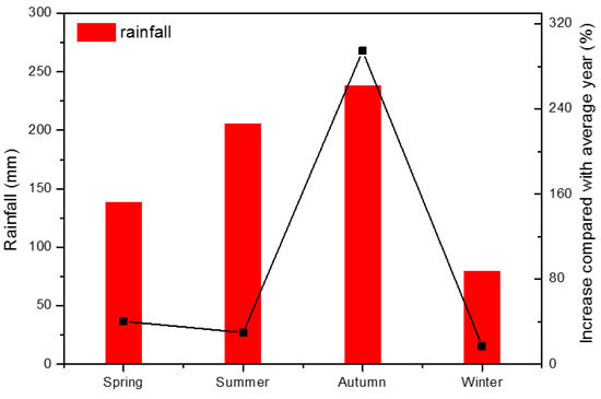 The seasonal fluctuation in amount of rainfall (bars) and increase compared with average year during the sampling time in this study (Taihu Basin Authority of Ministry of Water Resources, http://www.tba.gov.cn/slbthlyglj/).