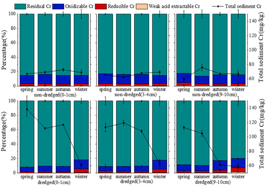 In the non-dredged and dredged sediments, concentrations of total sediment Cr varied 59.3–75.8 and 58.8–138.7 mg/kg, respectively (Figure 4). In both the non-dredged and dredged sediments, the magnitude of all four Cr fractions was ranked in the following order: weak acid extractable Cr < reducible Cr < oxidizable Cr < residual Cr. The weak acid extractable Cr, reducible Cr, oxidizable Cr, and residual Cr fractions in the non-dredged sediment varied 0.25–0.66, 1.65–2.28, 7.55–9.01, and 48.8–65.4 mg/kg, respectively. The concentrations of weak acid extractable Cr, reducible Cr, oxidizable Cr and residual Cr fractions in the dredged sediments ranged 0.23–0.70, 1.93–3.61, 7.28–9.77, and 47.0–127.7 mg/kg, respectively (Figure 4).