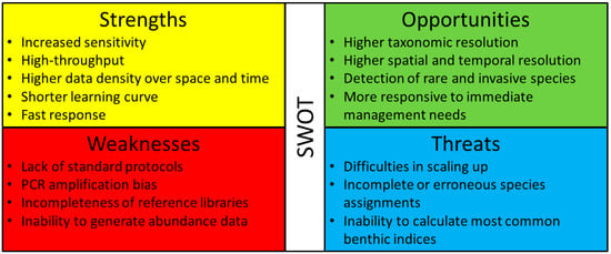 - Finally, standardized sampling is also highly desirable for allowing comparable descriptions of biodiversity in aquatic ecosystems and can also greatly benefit biomonitoring through DNA metabarcoding. In fresh waters, sampling should follow a standardized protocol that is usually implemented for ecological quality assessment based on morphological identifications (i.e., standardization of sampler type and procedure, mesh size, sampling period, distribution of sub-samples by instream habitats, and sub-sampling methods) [52,151]. Among other possibilities, for assessing hard-bottom communities in marine ecosystems, the deployment of artificial structures (e.g., ARMS, ASUs) for fixed periods of time, in combination with DNA metabarcoding, is very promising for achieving long-term or high-frequency monitoring.