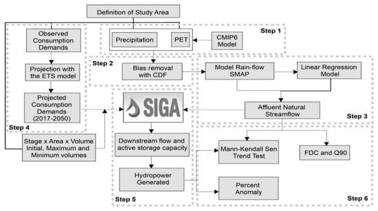 In Step 6, the regularized flows with 90% duration (Q90) and hydroelectric power analysis were performed through the Mann–Kendall Sen test and percentage anomaly. The next topics discuss the study region, database, and methodology applied.