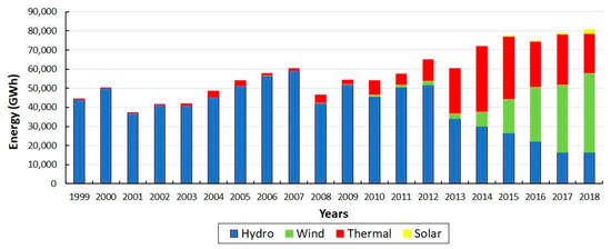 Figure 3. This shortfall was mainly replaced by fossil fuel energy (thermal) with 39%, 47%, 42%, 33% and 25%, and the growth of wind energy with an increase from 5% to 52% during this period.
