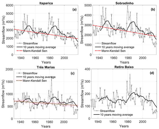 3/s in Retiro Baixo, and they were all registered in the last years. This fact reflects the prolonged water scarcity that has reached the SFRB in recent years, especially in those basins that are totally or partially inserted in the semi-arid region, such as the Itaparica and Sobradinho. In those basins, the Mann–Kendall Sen test indicated a negative trend.
