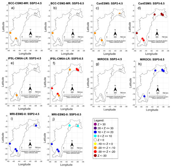 17]. The MIROC6 and MRI-ESM2-0 models indicated a positive trend. In contrast, the other models projected a negative trend, with the declivity of the CanESM5 model presenting a value below −30 for the Queimado, Sobradinho, Itaparica, Moxotó, Xingó and Complexo Paulo Afonso reservoirs.