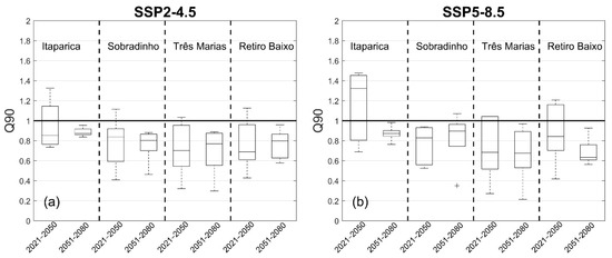 Figure 10 presents the box-plots of the ratio between Q90 for the SSP2-4.5 and SSP5-8.5 scenarios varying in 30 years (2021–2050 and 2051–2080), respectively, and Q90 in the historical period (1901–2000) for the SFRB reservoirs, corresponding to the five models analyzed. The models indicated reductions in Q90 for most of the SFRB reservoirs and the two analyzed periods. The exception was the Itaparica reservoir, which for the SSP5-8.5 scenario from 2021 to 2050, the model median indicated an increase in Q90. The increase in Q90 presented by the Itaparica basin may be related to the low calibration of the SMAP model (with a low NASH index of 0.36 according to