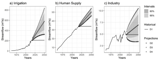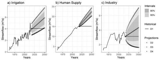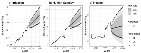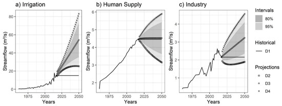 The ETS model projected growth scenarios for the period 2018 to 2050 for most of the consumptive demands. The exception was the D2 scenario (more optimistic). In this scenario, industrial demands reduced its withdrawals with an average annual rate of −3.73%, −0.70%, −0.08% and −1.53% for the reservoirs of Itaparica, Sobradinho, Três Marias and Retiro Baixo, respectively. Human supply also showed a reduction on the average annual rate of −1.02% for the reservoir of Três Marias in the D2 scenario.