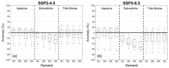 For the consumptive demands, Sobradinho’s HPP was the one that showed the highest sensitivity to future scenarios of these demands. It presented a more significant decrease in the hydroelectricity generation when the demands became more pessimistic. The D4 scenario presented greater intensity of the decrease in hydroelectric power with a median of less than −50%. For Três Marias and Itaparica HPP, there was little change of the consumptive demands, with the medians of the anomalies close to −10% and 10%, respectively, in the two climate scenarios (SSP2-4.5 and SSP5-8.5).