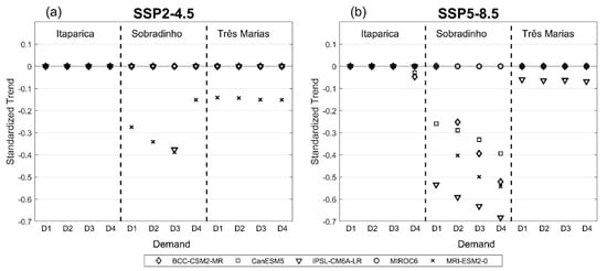 Among the models that indicated reductions in electricity generation, the IPSL-CM6A-LR model stands out, reaching the −0.7 slope module in scenario D4. In the Três Marias UH, for the SSP2-4.5 scenario, only the MRI-ESM2-0 model presented a significant trend with a negative slope in all scenarios of consumptive demands. In contrast, in the SSP5-8.5 scenario, only the IPSL-CM6A-LR model presented a significant trend, which was also negative. In the Itaparica HPP, only in the SSP5-8.5 climate scenario and in the D4 demand scenario, the BCC-CSM2-MR and CanESM5 models presented a significant trend with negative declivities close to −0.05.