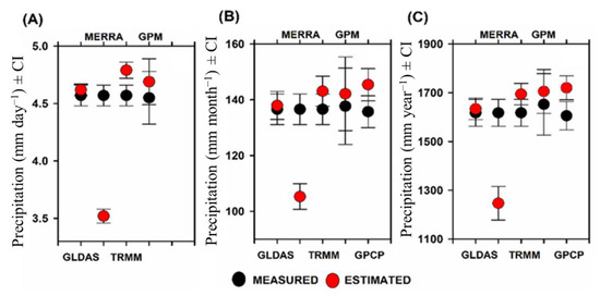 Averages values with the corresponding ± Confidence Interval (CI) of (A) daily (mm day−1), (B) monthly (mm month−1), and (C) annual (mm year−1) precipitation as measured by conventional weather stations and estimated by GLDAS, MERRA, TRMM, GPM, and GPCP products in the state of Mato Grosso, Brazil. For (A), the daily values for the entire study period were averaged, while for (B), the monthly values for all months during the study period were averaged, and the annual values in (C) were the annual values averaged for all years during the study period.