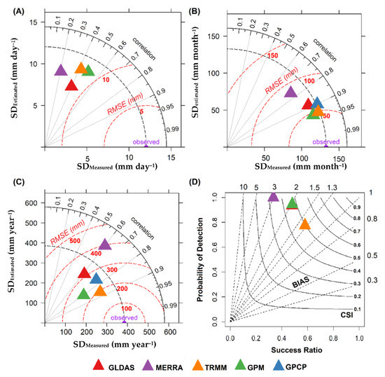 Taylor diagrams showing the comparisons of (A) daily (mm day−1), (B) monthly (mm month−1), (C) annual (mm year−1) measured and estimated precipitation as well as (D) the performance diagram of GLDAS, MERRA, TRMM, GPM, and GPCP products in the state of Mato Grosso, Brazil. In panels A, B, and C, the Pearson correlation coefficient (r) is represented by the azimuth angle (black outlines), the Root Mean Square Error (RMSE) is represented by the red dashed outlines, and the standard deviation (SD) was indicated on the x and y axes, respectively. In panel D, the probability of detection (POD) is represented on the x and y axes; the BIAS was indicated by the dashed black lines; and the critical success index (CSI) is represented by continuous black lines. For (A), the daily values for the entire study period were averaged, while for (B), the total monthly values for all months during the study period were averaged, and the annual values in (C) were the annual values averaged for all years during the study period.