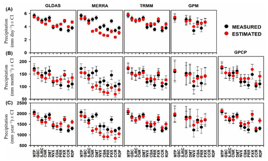 Average values with the corresponding ± Confidence Interval (CI) of (A) daily (mm day−1), (B) monthly (mm month−1), and (C) annual (mm year−1) precipitation as measured by conventional weather stations and estimated by the GLDAS, MERRA, TRMM, GPM, and GPCP products in the state of Mato Grosso, Brazil. For (A), the daily values for the entire study period were averaged, while for (B), the total monthly values for all months during the study period were averaged, and the annual values in (C) were the annual values averaged for all years during the study period.